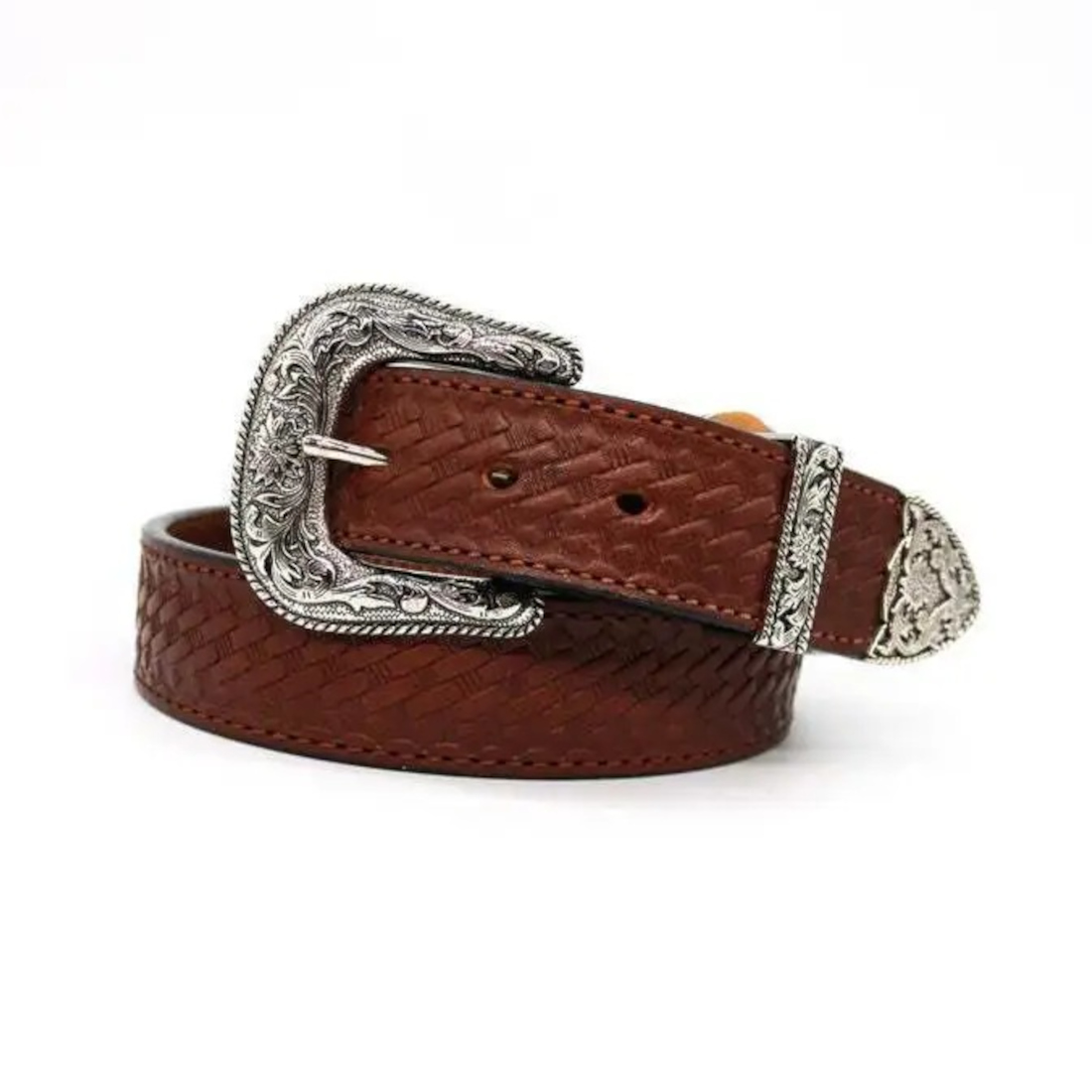 Hand tooled leather belt with 3 pieces buckle set