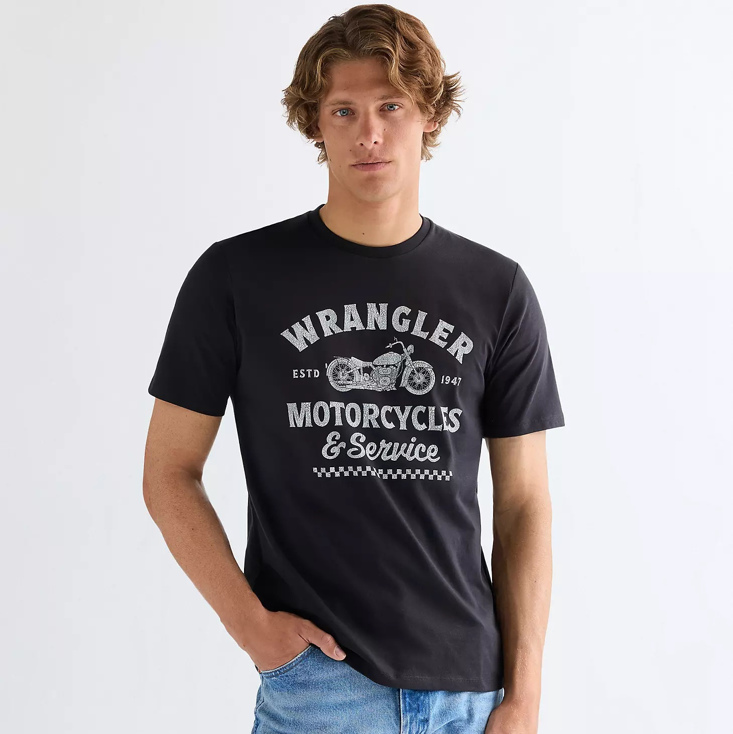 This Wrangler classic crew neck t shirt comes in soft and airy cotton with a fabric weight of 206 GSM, complete with motorcycle graphics that celebrate our legacy. Featuring graphics that celebrate the motorcycling legacy, this season’s Americana T-Shirt is ready for the ride. 100 % cotton that stays comfortable all year long. Easy-wearing regular fit with a classic crew neck. Made from heavyweight jersey cotton that provides all-day comfort. Large Wrangler motorcycle graphic print on the front.